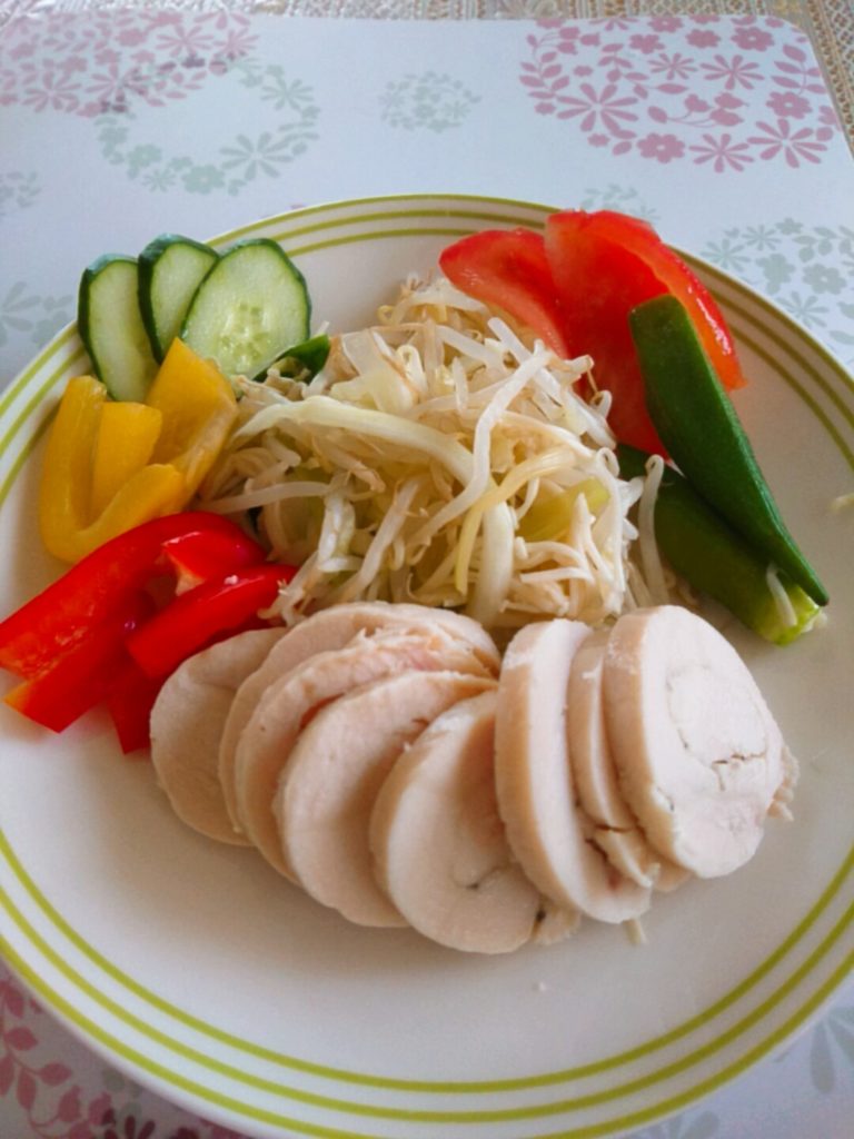 今日は昨日のうちに作っておいた鶏ハム(最近では我が家の主食級)と蒸し野菜や